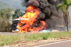 Carreta é consumida pelo fogo na Rota do Sol