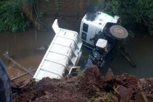 Ponte cede e caminhão despenca no Caraá