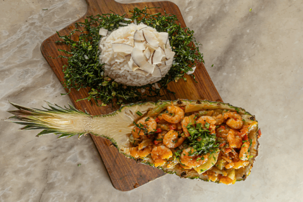 Um prato tropical e sofisticado: camarões e chuchu delicadamente refogados, servidos dentro do abacaxi, acompanhados de arroz cremoso de coco e couve crispy crocante. Uma explosão de sabores e texturas.