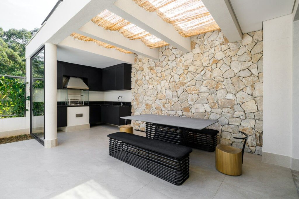 Elementos em preto, como puxadores, luminárias e peças artísticas, são essenciais para a unidade visual do espaço. Neste projeto assinado pelo arquiteto, a escolha de uma luminária linear e o uso do preto nos detalhes da escada harmonizado com a madeira, acarreta ao ambiente uma elegância fluida e uma atmosfera acolhedora sem sobrecarregar. A parede de pedra, por sua vez, adiciona um toque de equilíbrio ao conjunto.