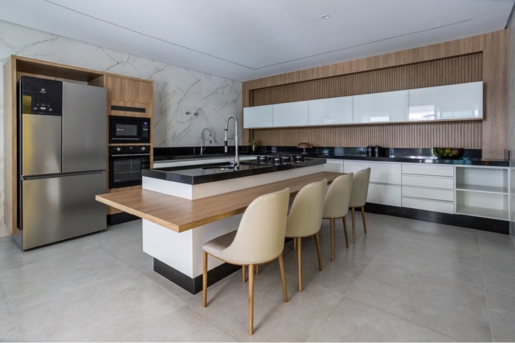 Cozinha integrada com bancada central em madeira, contrastando com o preto e branco dos armários, granito e eletrodomésticos