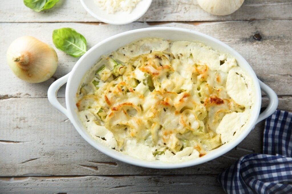 Em um liquidificador, bata o queijo cottage, o leite desnatado, uma pitada de sal, a noz-moscada e a pimenta-do-reino até obter um creme homogêneo. Em um refratário, espalhe os floretes de couve-flor e acrescente o refogado de cebola e alho por cima.