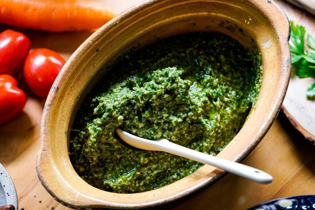 Em um liquidificador, coloque as ramas de cenoura, as folhas de manjericão, o alho, as nozes, o queijo e o azeite e bata até obter uma consistência homogênea. Transfira para um recipiente e tempere com sal e pimenta-do-reino. Sirva em seguida.
