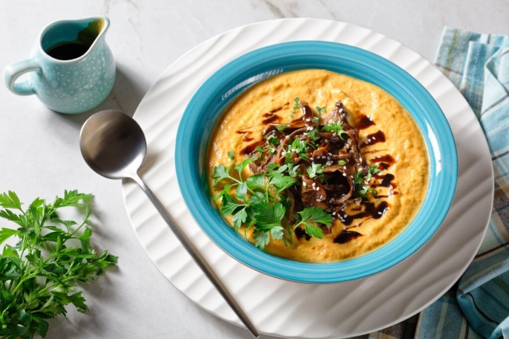 Sopa de abóbora com caldo de cogumelos e leite de coco