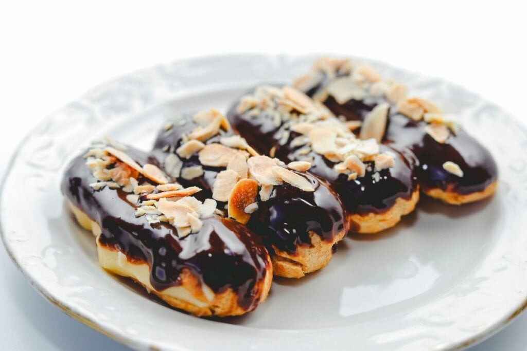 Para a cobertura, derreta o chocolate meio amargo, em banho-maria, com o creme de leite até formar uma ganache lisa. Recheie os éclairs com o creme frio, corte com cuidado ou injete com bico. Banhe o topo no chocolate, decore com amêndoas e sirva gelado ou em temperatura ambiente.