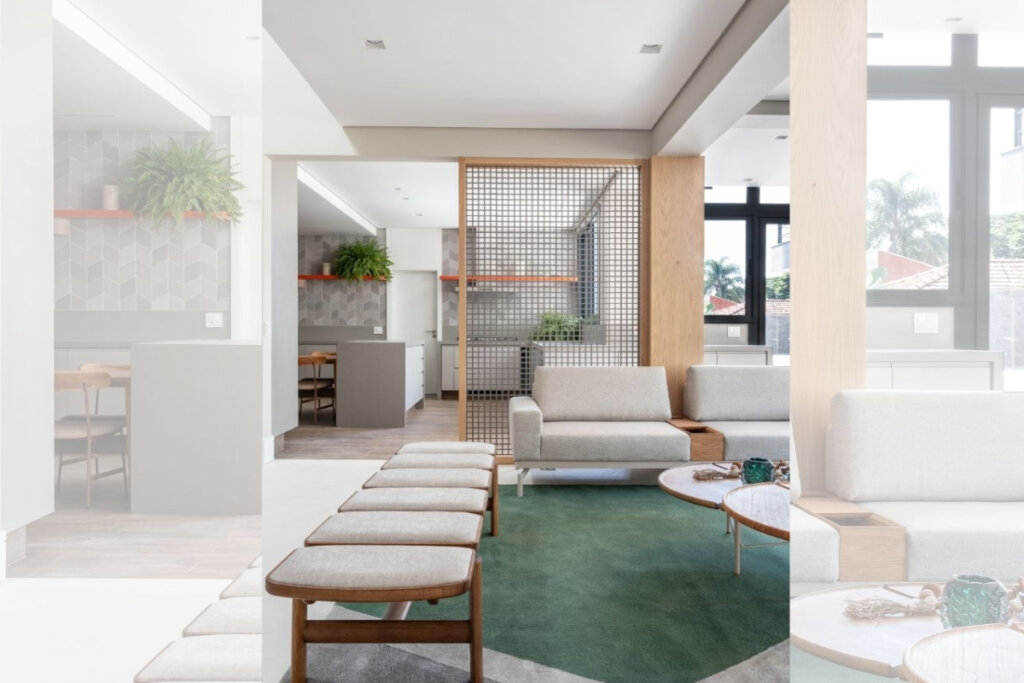 Painéis vazados em madeira permitem separar ambientes sem bloquear luz natural ou ventilação. Essa solução cria transições suaves entre espaços integrados, mantendo privacidade parcial e organização, além de agregar textura e ritmo à arquitetura de interiores.