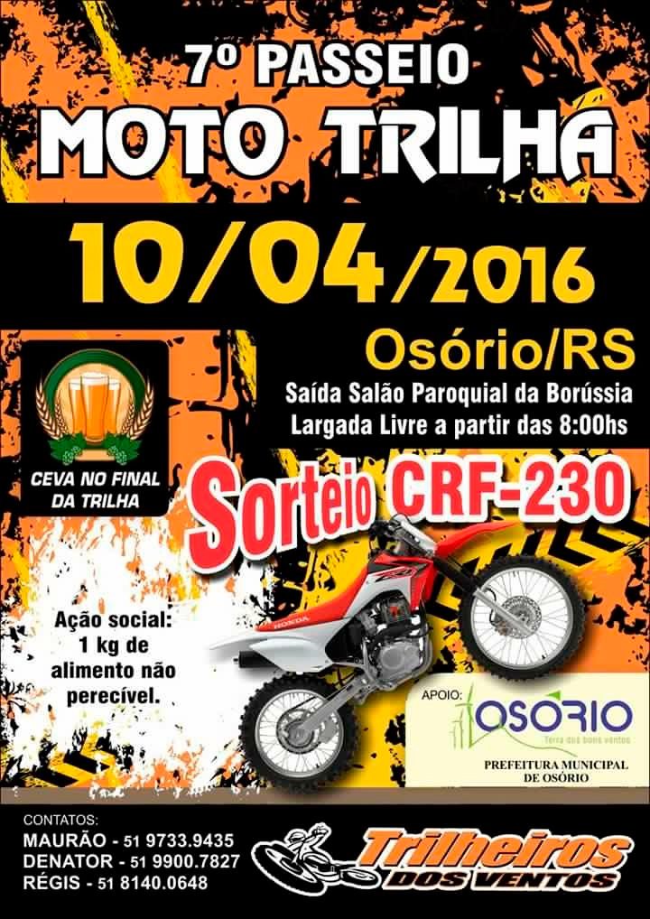 Acontece neste domingo (10), o 7° Passeio Moto Trilha, em Osório. A partir das 8h, no Salão Paroquial da Borússia, inicia o evento. Maiores informações com Maurão: 51 9733 9435…