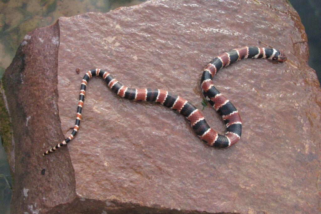 A cobra-coral verdadeira, encontrada principalmente no Brasil, Argentina e Paraguai, é reconhecida por sua coloração vibrante, com anéis vermelhos, pretos e brancos dispostos em sequência.