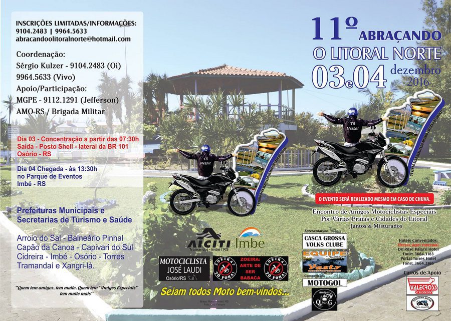 Um dos mais tradicionais eventos de motociclistas da região, o Abraçando o Litoral Norte chega, em dezembro, em sua 11ª edição. Nos dias 03 e 04 serão percorridas diversas cidades do Litoral Norte, entre elas Imbé, que receberá os participantes no Parque Municipal de Eventos, no encerramento das atividades.