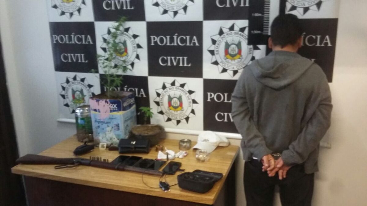 Em poder dele foi encontrado e apreendido pés de maconha, porções já embaladas da mesma droga, uma arma de fogo, munições, aparelhos celulares, diversas anotações e dinheiro, em notas fracionadas.