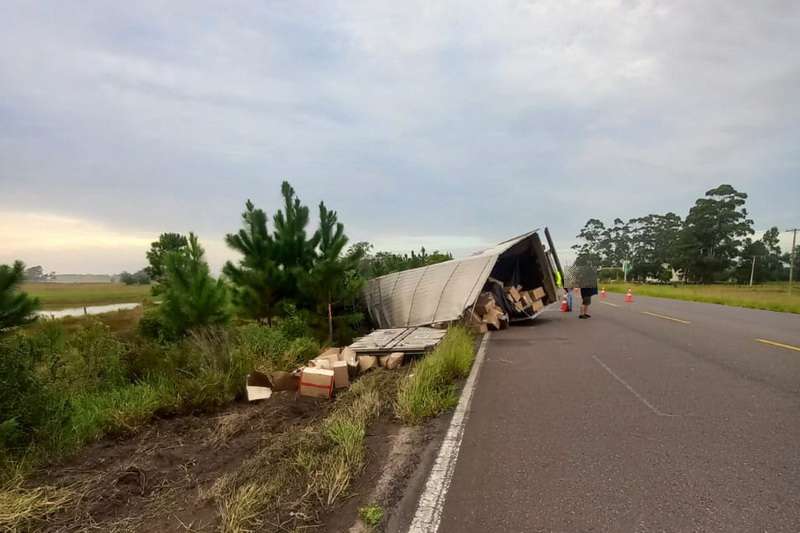 Um caminhão VW/8.160 DRC 4X2, com placas de São Paulo, tombou após desviar de um bovino na ERS 389, KM 60, em Arroio do Sal.