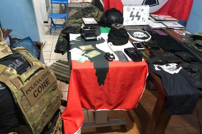 A polícia encontrou bandeiras e fotos nazistas e fascistas, imagens de Adolf Hitler e Benito Mussolini, simulacro de arma de fogo, facas, canivetes, fardas camufladas e capacetes.