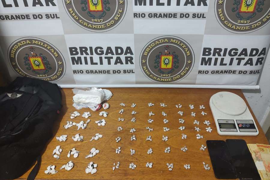 Com os adolescentes foi encontrada uma mochila contendo 231 porções de crack, 79 porções de cocaína, balança de precisão, dois celulares e um valor de R$ 40.