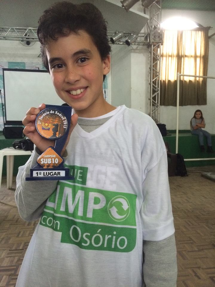 Esse é mais um troféu da coleção do estudante que tem demonstrado habilidades neste tipo de jogo. Marcos, que estuda em uma das escolas parceiras do Programa Jogue Limpo com Osório, ajuda a divulgar a importância do mesmo.
