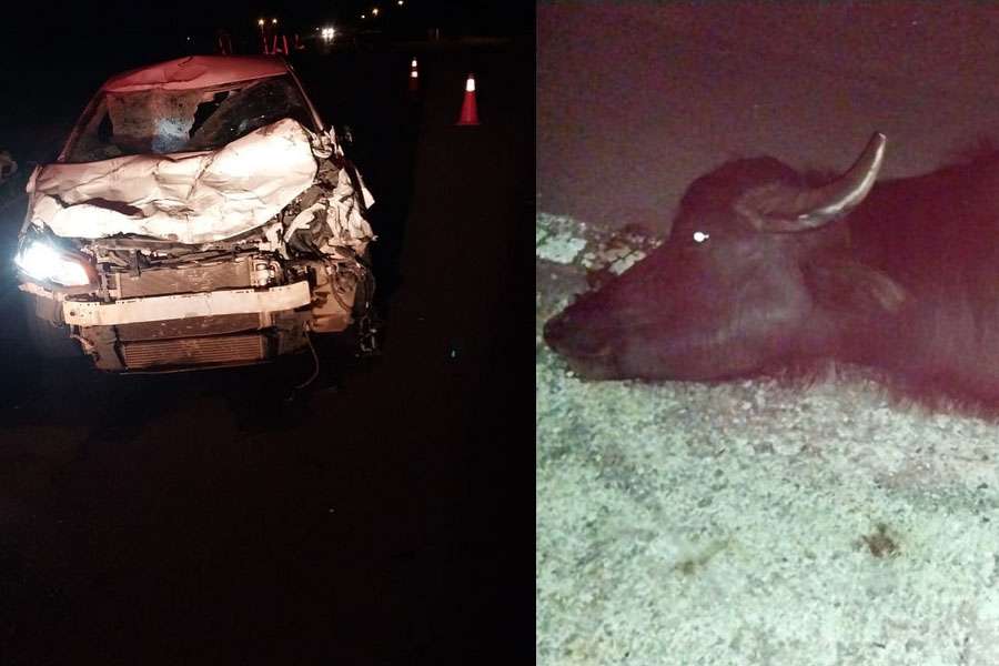 O motorista de um Chevrolet Cruze não conseguiu desviar e acabou colidindo o veículo contra búfalos na rodovia.
