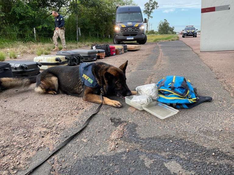 O K9 Clif, um dos cães farejadores, rapidamente indicou uma mochila no compartimento de bagagens. Dentro dela, foram encontrados cerca de 290 gramas de Skunk.