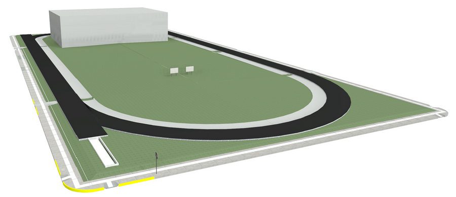 A pista será de pavimentação asfáltica com quatro raias, contendo pista de revezamento e caixa de areia para salto em distância.