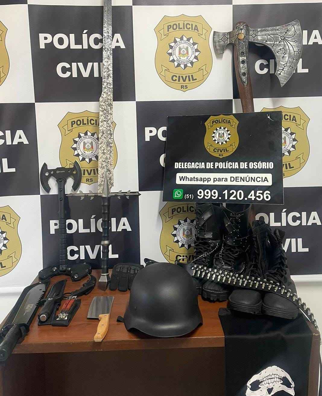 O trabalho articulado entre a Delegacia de Polícia do município e agentes do Instituto-Geral de Perícias (IGP) levou à apreensão de armas brancas, objetos táticos e outros materiais que, segundo as investigações, seriam utilizados para executar uma ação violenta contra uma instituição de ensino do município.