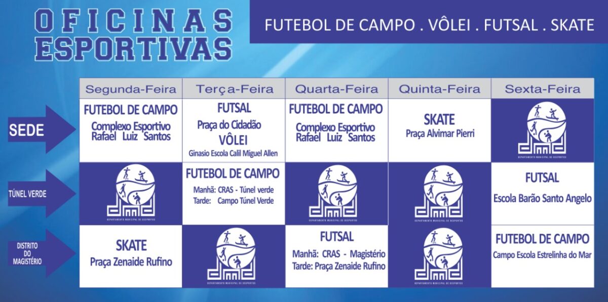 As oficinas acontecerão na Sede – Balneário Pinhal -, Túnel Verde e Magistério, oportunizando a todos os estudantes atividades esportivas no contraturno da escola – das 9h às 11h e das 14h às 16h. As inscrições podem ser feitas nos locais das oficinas, diretamente com o professor.