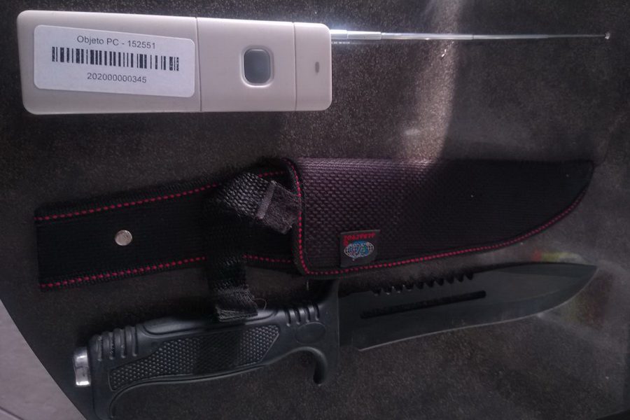 Em revista no interior do Sandero foi encontrado um aparelho bloqueador de sinal de alarme veicular conhecido como “Jammer” e uma faca tipo punhal.
