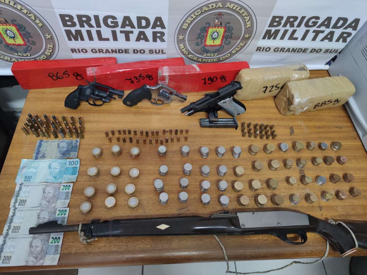 Os policiais militares recolheram também uma carabina calibre 22, uma pistola calibre 765 e dois revólveres calibre 38, além de 81 munições e R$ 957,00 em dinheiro. Todo o material estava dentro de uma mochila.