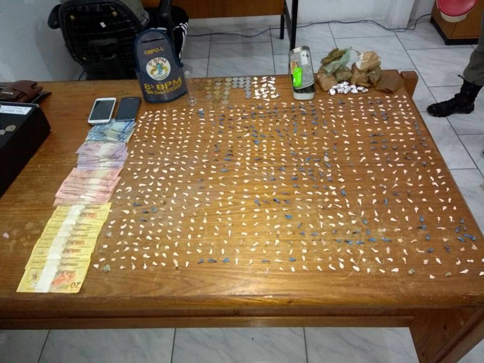 Com a acusada foram encontradas 834 pedras de crack, seis torrões grandes, 11 torrões pequenos de maconha, 19 “petecas” de cocaína, e dois aparelhos celulares marca Samsung, sem procedência.