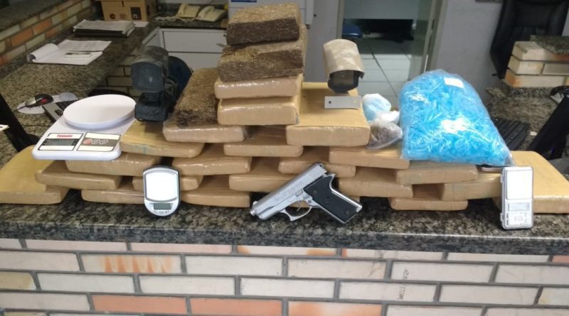 Além das drogas foram apreendidas, balanças de precisão, simulacro de pistola, câmeras CFTV, celulares e um saco de pinos para embalar cocaína.