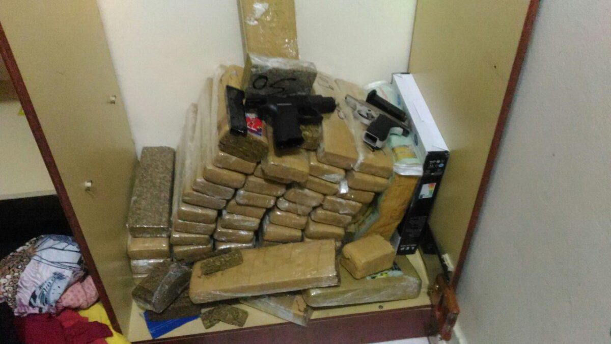 Na casa dos criminosos, na Rua Rondônia, em Nova Tramandaí, foi localizado em um dos quartos, 39,204 kg de maconha, uma pistola Bersa 380, dez munições 380, uma pistola israelense, três balanças de precisão, três rolos de plástico filme, entre outros objetos.