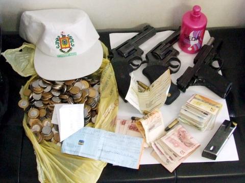 Foram apreendidos dois revólveres cal. 38 e uma pistola cal .40, de uso restrito, municiados, e com numeração raspada, R$ 1.000,00 reais, em dinheiro (levados do supermercado) e um veículo Pálio, que havia sido roubado no bairro Santa Cecília, em Porto Alegre, em 21 de janeiro.