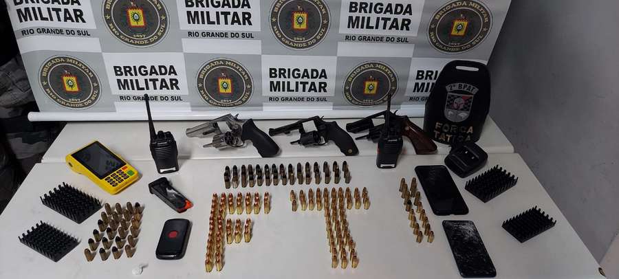 Com os indivíduos foram localizados três revólveres calibre 38, seis munições do mesmo calibre, 117 munições calibre .40, 63 munições calibre .9mm, um carregador de pistola, dois rádios comunicadores, uma máquina de cartões de crédito, uma porção de cocaína e três celulares.