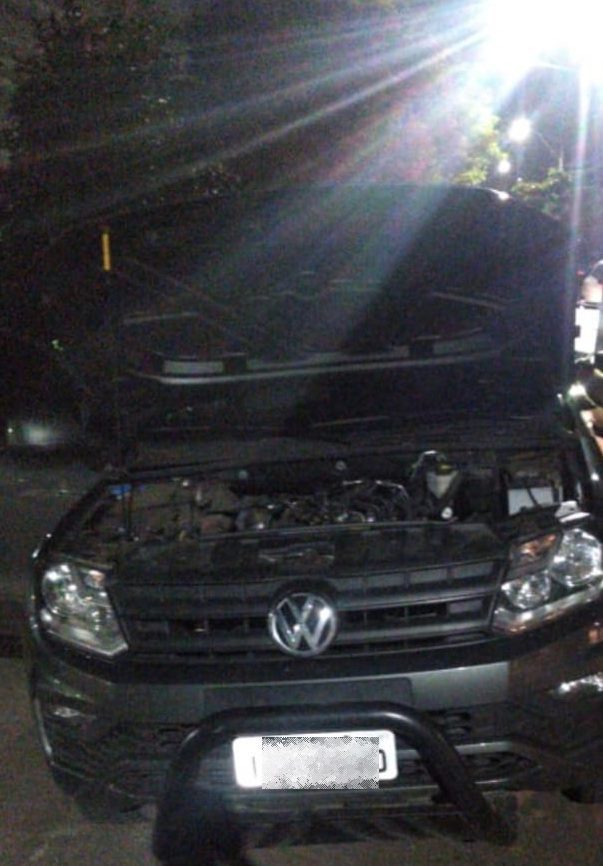 Após obterem a informação de que uma caminhonete Volkswagen Amarok, de cor cinza, estaria circulando e gerando suspeitas próximo ao farol, uma equipe de motociclistas da BM conseguiu abordá-la e na fiscalização foi constatado que era clonada.