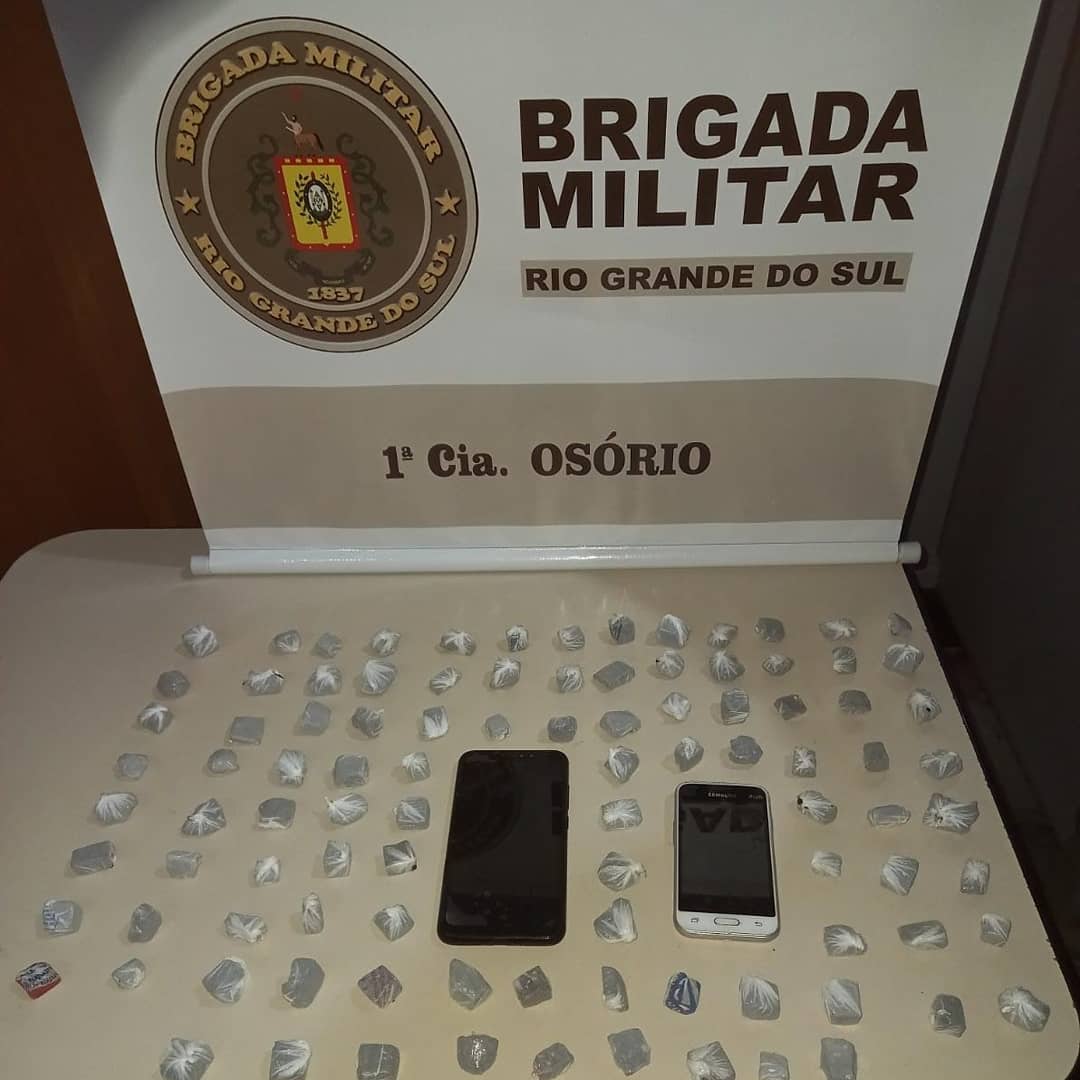 Em um terceiro momento, a Força Tática realizava patrulhamento no entorno da Penitenciária Modulada Estadual de Osório (PMEO), quando abordou um casal em um veículo, sendo constatado que havia uma terceira pessoa com eles, o qual foi localizado em um matagal ao lado da penitenciária, onde em busca pessoal foram encontradas 99 porções de maconha e dois aparelhos celulares.