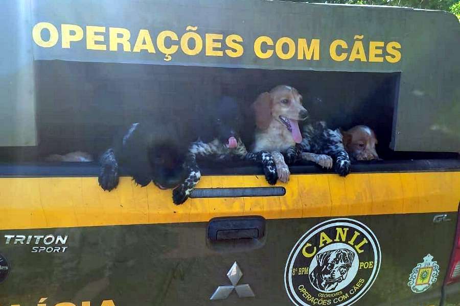 No local os policiais militares encontraram 18 cães, das raças Spaniel Bretão, Pointer Inglês e Setter Inglês, sendo 12 adultos e 6 filhotes, mantidos em situação precária, em local inadequado.
