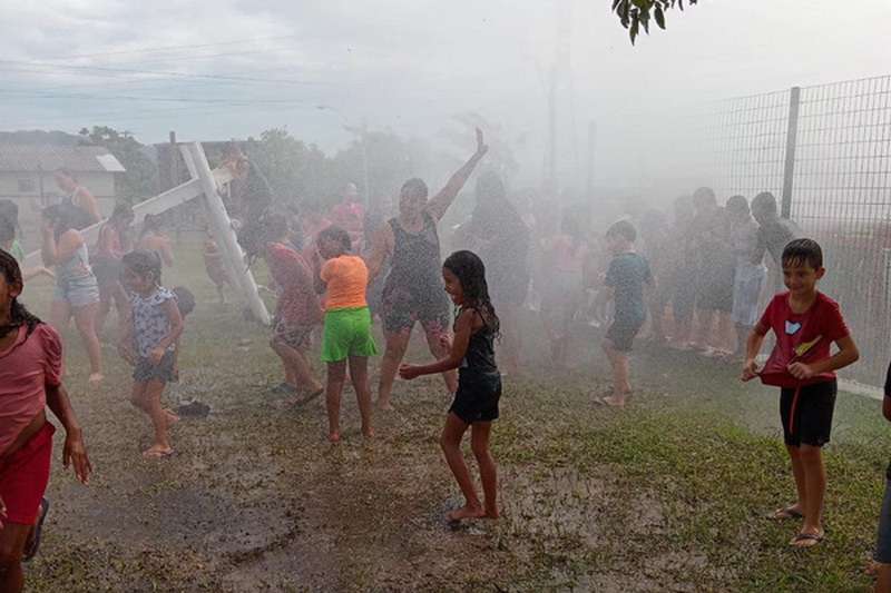 Em meio às altas temperaturas, os bombeiros promoveram uma interação especial com as crianças, jogando água e transformando o calor escaldante em pura diversão.