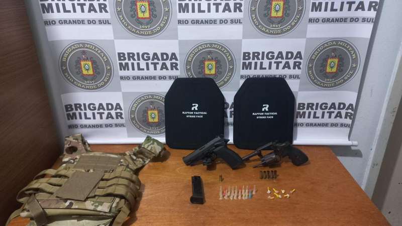 Um dos homens, de 34 anos, com antecedentes por tráfico, lesão corporal, ameaça e receptação de veículo, usava um colete balístico e portava uma pistola calibre 9mm com numeração rasurada, munição e carregador sobressalente.