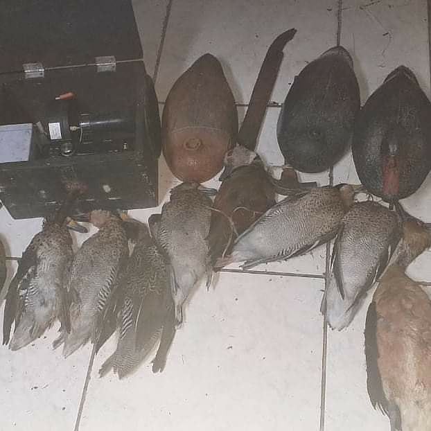 No local, foram identificados quatro homens e com eles restaram apreendidas três espingardas, calibres .12, .20 e .28, grande quantidade de cartuchos, caixas de som com “chama auditiva” (simulacros de animais que reproduzem som da espécie caçada), chamas comuns (simulacros de animais de borracha), e dez animais abatidos.