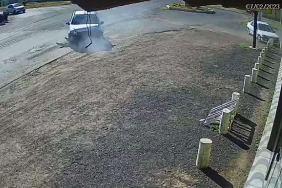 Uma câmera de vigilância flagrou o momento de um acidente envolvendo dois veículos no final da manhã desta terça-feira (07), em Balneário Pinhal.