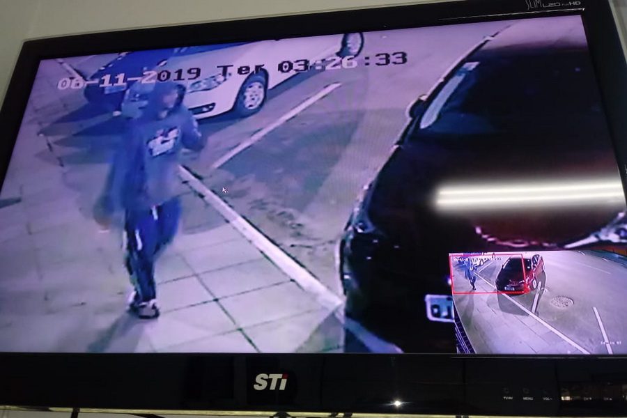 Nas imagens dá para ver que o criminoso passa algumas vezes pelo local, antes de cometer o crime.