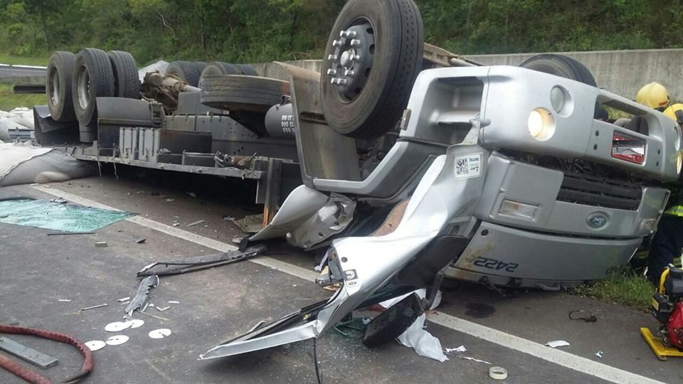 Caminhão carregado com cimento tomba e deixa duas pessoas gravemente feridas na BR-101