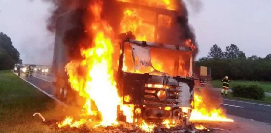 Um caminhão baú refrigerado, carregado com frango congelado, foi destruído pelo fogo no início da manhã deste sábado na freeway.