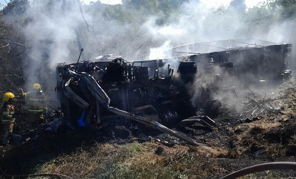 Poucos instantes depois, o caminhão pegou fogo, exigindo uma rápida resposta dos bombeiros para conter as chamas.