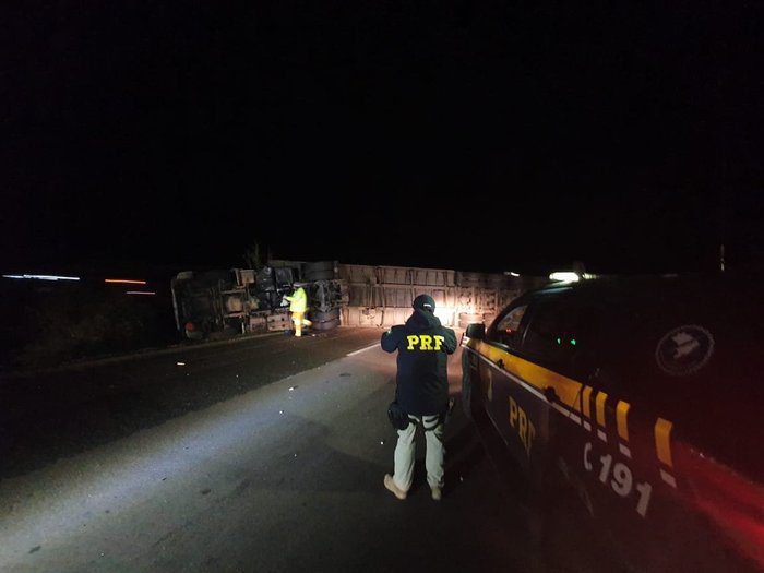 Um caminhão tombou no km 70 da BR-101, em Osório, na madrugada desta quinta-feira (1º).