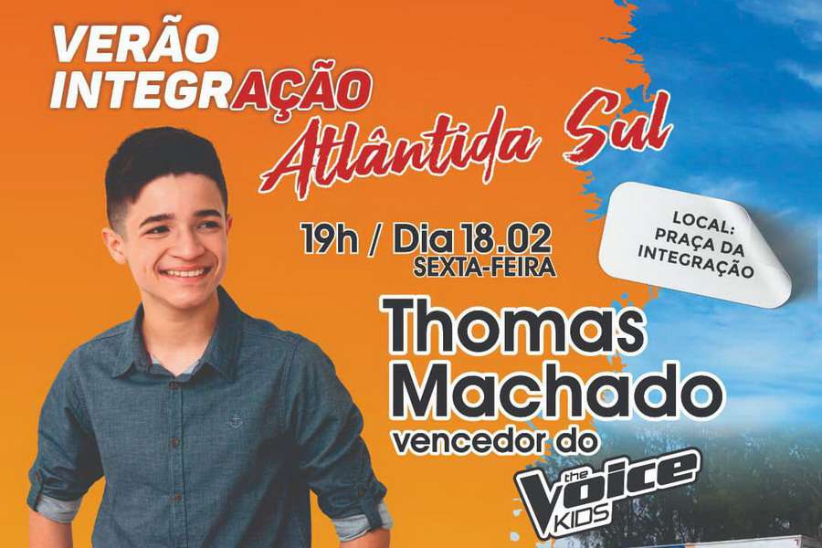 O campeão do The Voice Kids se apresenta na Praça da Integração, às 19h.
