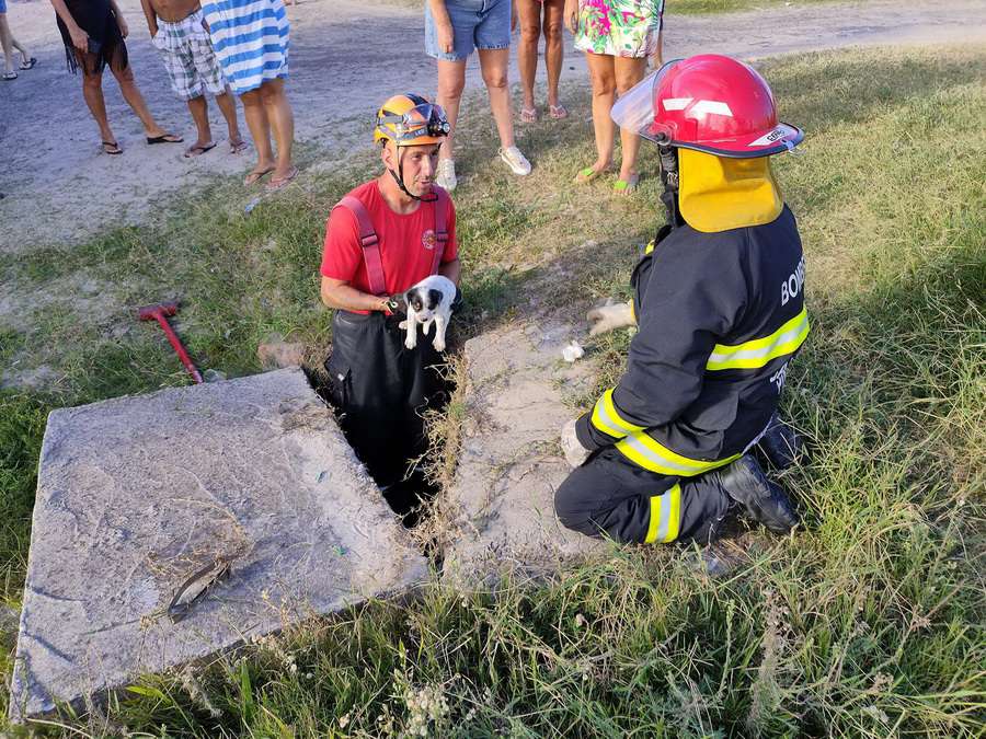 Um cão preso em bueiro foi salvo no centro de Balneário Pinhal.