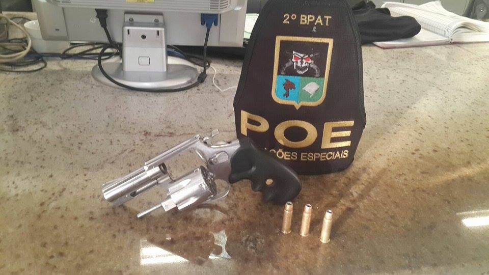 A guarnição procedeu abordagem ao carro, sendo encontrado com um homem, um revólver marca Rossi de numeração raspada.