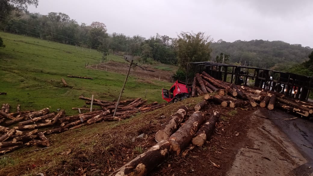 A carga de madeira ficou sobre parte da pista, deixando o trânsito parado.