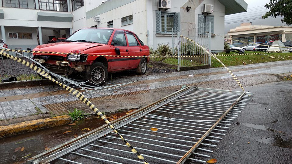 Com o impacto, um dos veículos colidiu no prédio da Delegacia de Polícia e posteriormente acabou derrubando o portão do local.