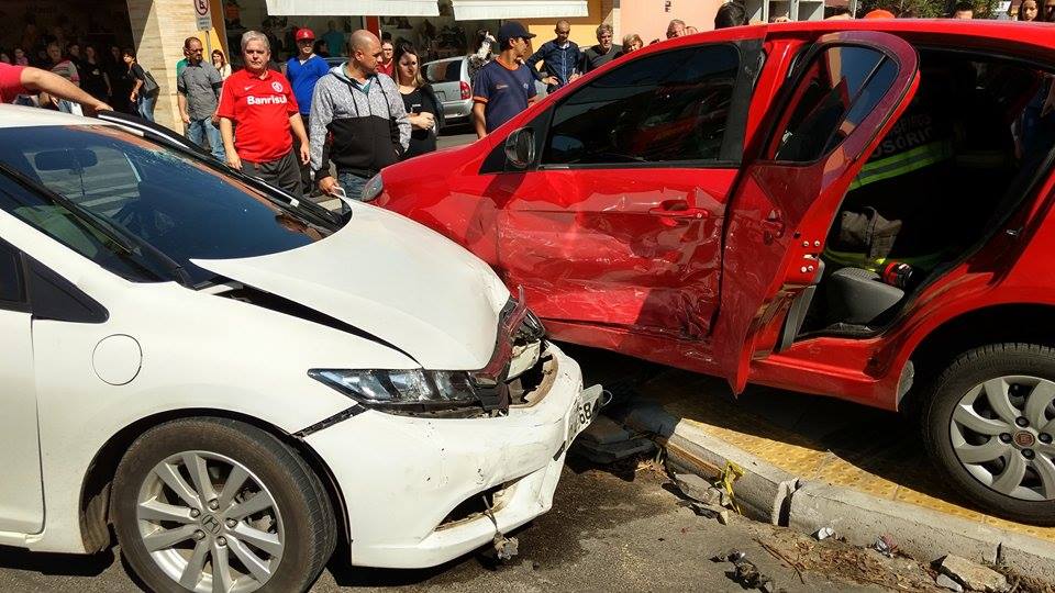 Um veículo acabou invadindo a calçada após colisão com outro carro, por volta das 12h40min deste sábado, na esquina das ruas Júlio de Castilhos e Major João Marques, no centro de Osório.