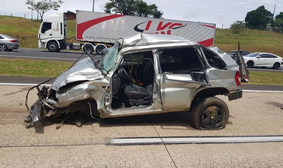 Constaram que uma camioneta TR4 saiu da pista e capotou várias vezes no canteiro central.