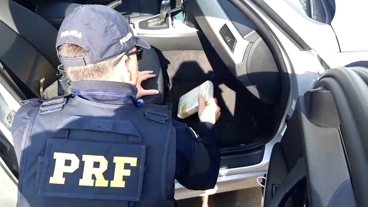 Durante a fiscalização dos equipamentos e dos sinais identificadores do carro, os agentes encontraram um quilo de cocaína embaixo do banco.